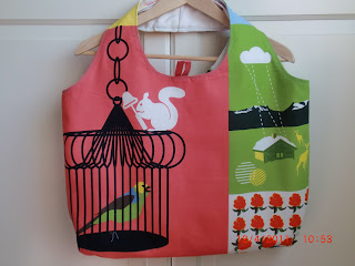 La tela estampada és de Ikea. La bossa és reversible, tot i que el patró original no va folrat, si us interessa es poden trobar les instruccions per fer-la folrada i reversible al blog de verypurpleperson.