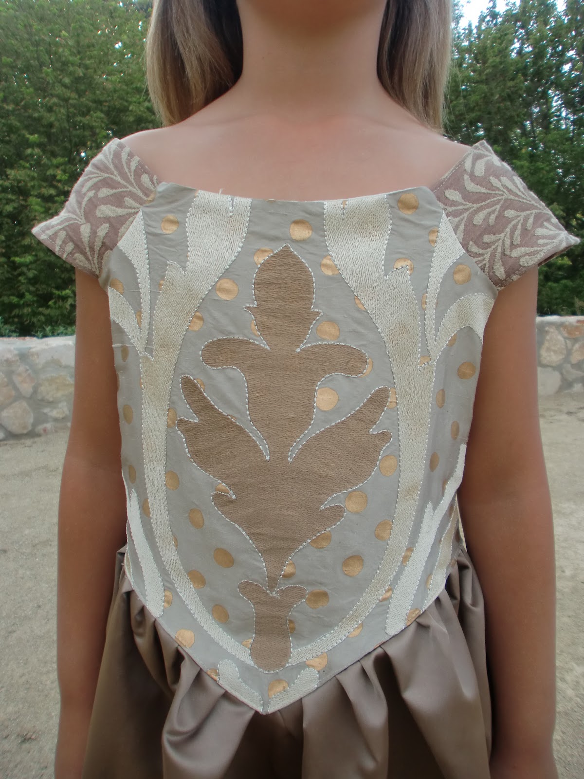 El cos del vestit està fet  amb  una tela de seda  brodada i estampada amb  lunars daurats que em va donar  ma mare. És  preciosa. Em va fer un yu-yu ficar-li les tisores!!!