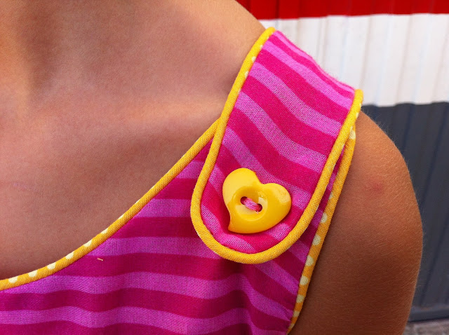 ResponEliminaThe piping is spot on and I love how the shoulder buttons on one side. This is just perfect for your girl.