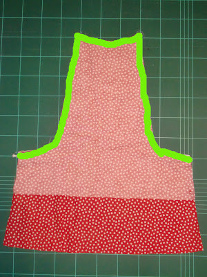 Sew along the side edges and top (neckline), as close to the piping as possible. Begin with the curved area (where you inserted the piping) (it is important not to sew the sides of the dress, which will be attached to the back of the dress), continue sewing the neckline (with no piping) and go down to the other curved side of the flap. See the green line in the picture: