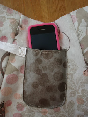 He puesto un bolsillo para el móvil y también un trozo de cinta para coserle un mosquetón -como no tenía lo tengo aún pendiente de terminat-. El mosquetón es para sujetar las llaves y así localizarlas más rápidamente, con sólo tirar dela cinta.