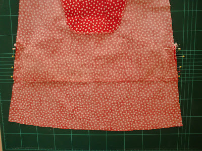 Lift the bottom part of the flap piece and match the bottom edge of the flap facing with the bottom edge of the front sides piece (see the arrows in the picture below to understand what I mean). Pin. This is going to be the bottom of the pockets, so don't worry if it doesn't match perfect. You can even trim it to make it match if you preffer.
