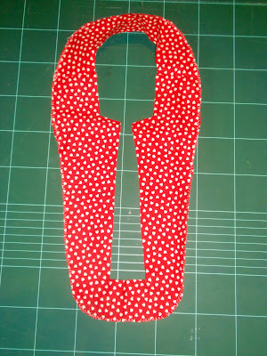 Los pasos, tal como indica el tutorial, serán primero coser el vivo (con la parte que tiene insertada la cuerda hacia dentro de la pieza y con los márgenes de costura siguiendo el borde de la pieza). Después (aún no) haremos unos cortes en los márgenes de costura en la zona curva (indicado en la foto con unas flechas).