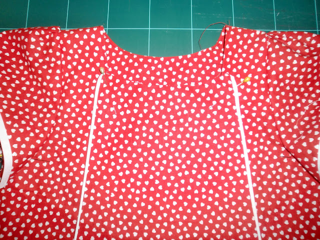 Lay the dress open flat, with right side up, and lay the facing you've sewn before on top of it with right sides together. Try to match as better as possible the inner edges of the facing and dress opening:
